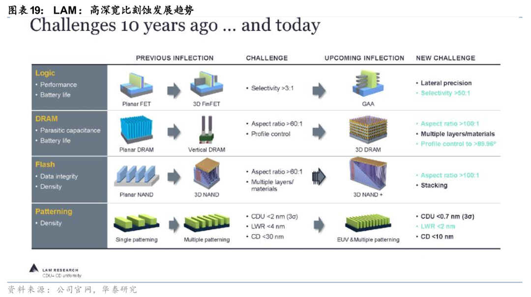 深沟槽技术已成为存储芯片发展的核心趋势。LAM在展会上指出,随着3D NAND向更高层数发展,每堆叠一层都需要更长的刻蚀时间,这种垂直堆叠趋势直接推动了高深宽比刻蚀技术的需求。深沟槽技术进展方面,LAM作为全球刻蚀设备龙头之一,在NAND通道孔蚀刻领域处于优势地位,正将高深宽比刻蚀技术逐步扩展到逻辑芯片领域;而东京电子在业绩会上披露,公司正在通过开发低温刻蚀新技术来挑战LAM在存储器领域的优势地位,目前已逐步取得客户的低温刻蚀订单。