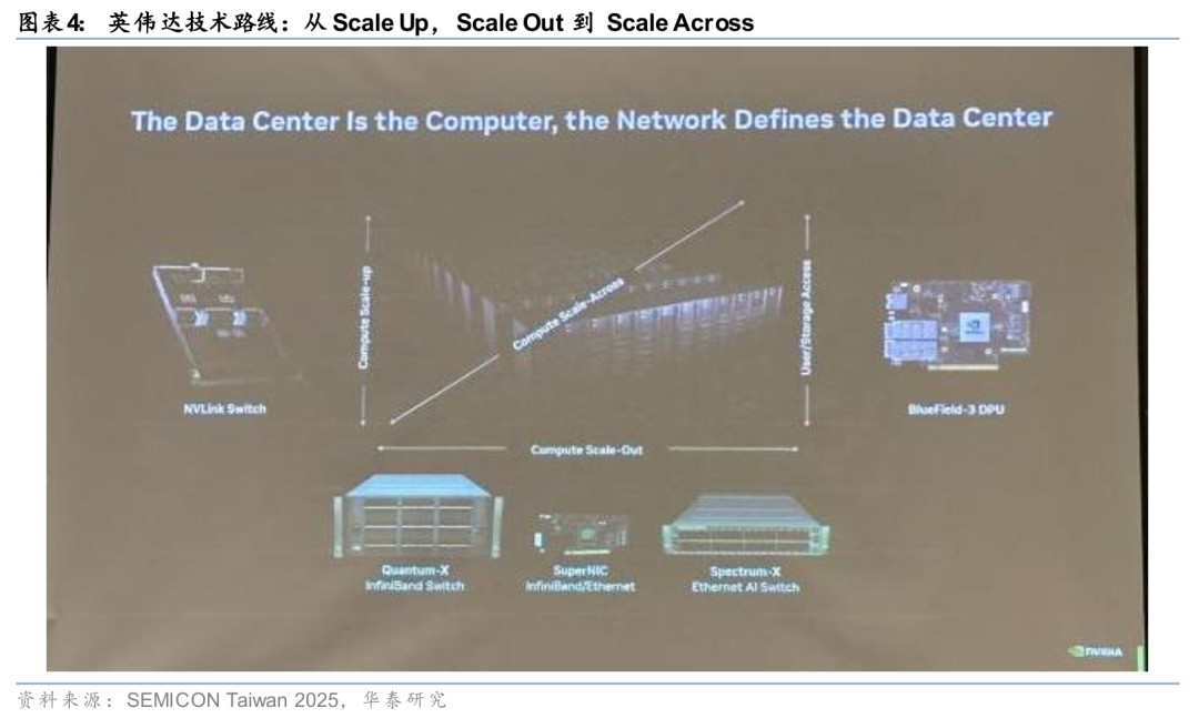 英伟达在本次展会上指出,数据中心就是AI时代的计算机。通过Scale up(机柜内)、Scale out(机柜之间)和Scale Across(数据中心间互联)等网络技术,把大量的GPU集合成一颗超大规模的GPU是AI计算未来发展的重要技术趋势。