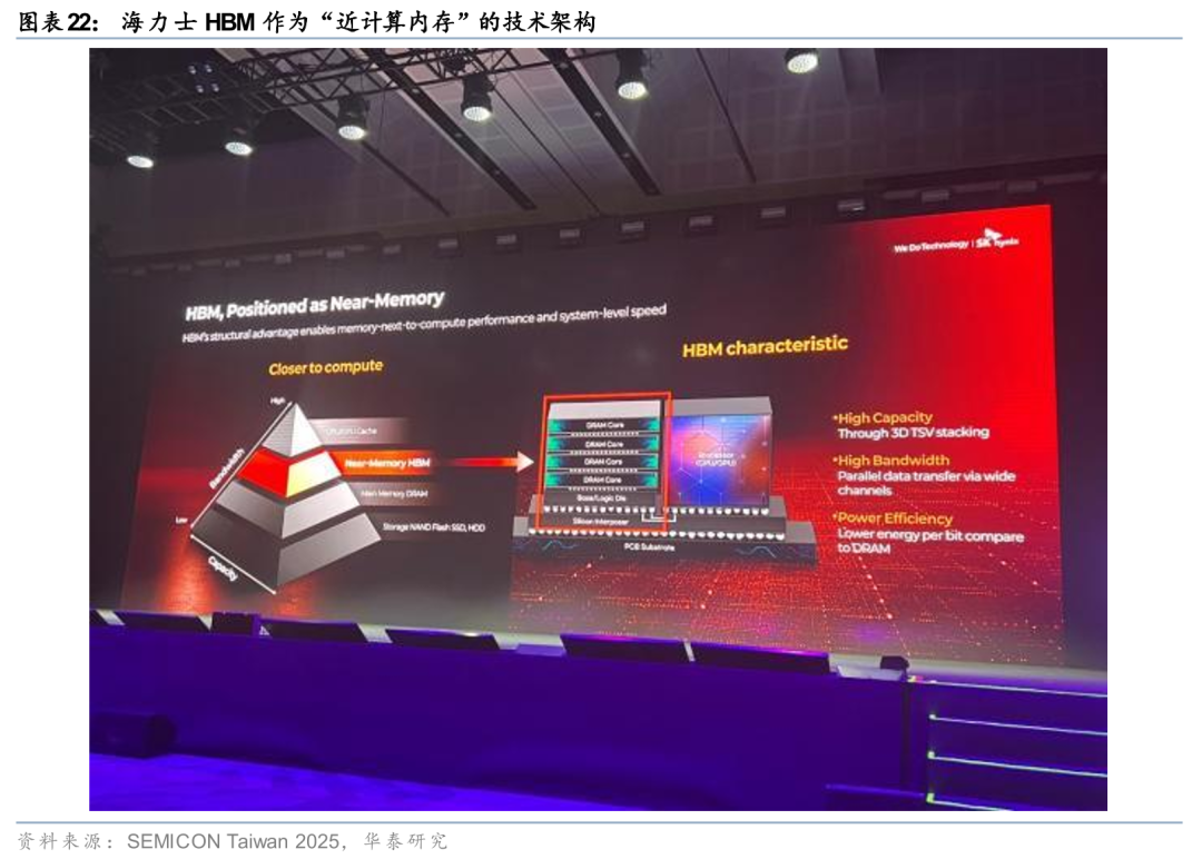 展会上,海力士指出,随着AI模型参数规模向万亿级扩展,传统内存架构已无法满足算力需求,而HBM的高容量、高带宽和低功耗特性将成为支撑大规模AI计算的必备基础设施和核心驱动力。1)从产业链角度看,我们认为HBM产业呈现较为集中的供给格局,全球具备量产能力的主要是SK海力士和三星两家企业,而下游AI生态系统从应用层到硬件层企业数量呈倒金字塔分布,这一供需结构凸显HBM作为AI算力基础设施的战略稀缺性。2)架构角度来看,海力士在展会上表示,通过3D TSV堆叠技术实现的“近计算内存”定位,能显著缩短数据传输路径并降低延迟,同时HBM3E通过200%带宽提升和40%功耗优化直接解决了AI训练推理的“内存墙”瓶颈,在数据中心功耗高速增长的背景下具有重要战略意义。展望未来,我们预计HBM或将成为AI专用加速器时代下存储产业链盈利增长的核心驱动力。