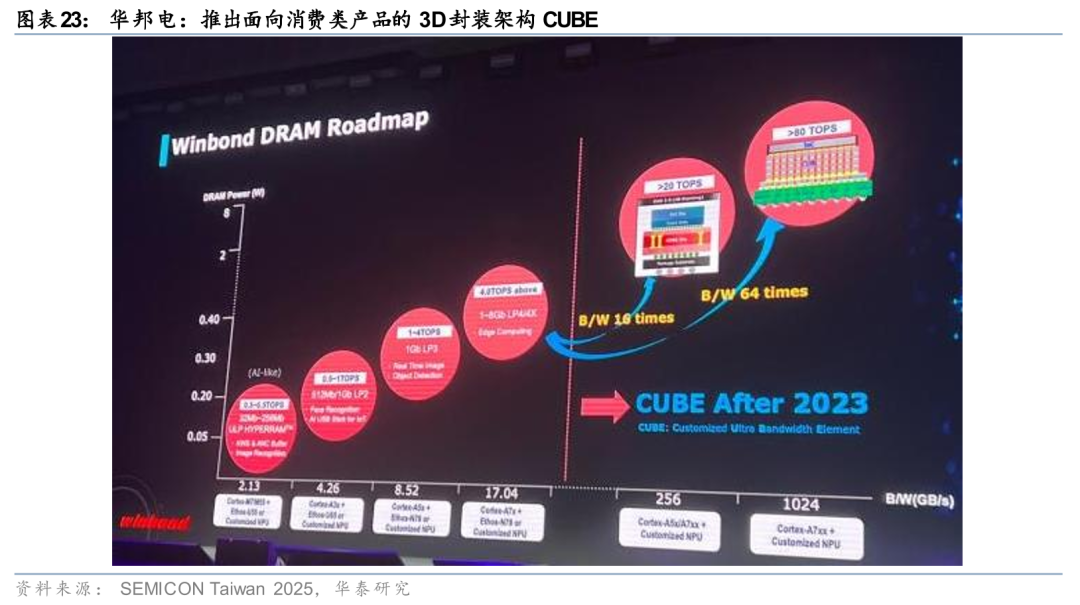随着边缘人工智能(Edge AI)的快速发展,存储器在边缘设备中的重要性日益凸显。当前,传统的内存架构难以满足边缘AI对高带宽、低功耗和小尺寸的需求,因此以3D DRAM堆叠技术为核心的创新方案成为行业关注的重点。展会上,华邦电提出的定制化存储器CUBE,采用TSV Microbump工艺,其3D堆叠架构可将计算与存储芯片垂直集成,提升算力密度和能效比。CUBE的核心优势包括在超高带宽与密度方面,华邦电致力于将带宽从每秒7 GB提升至每秒3 TB,并能处理每秒3万个token。 在特定应用案例中,传统LPDDR4可能需要多达八个芯片,而使用华邦电的CUBE方案可能仅需一到两个芯片,即可在50平方毫米的微小尺寸内提供高达每秒128 GB的带宽。 对于需要更高密度和带宽的应用,CUBE可以提供高达每秒30 TB的带宽和70 GB的密度。