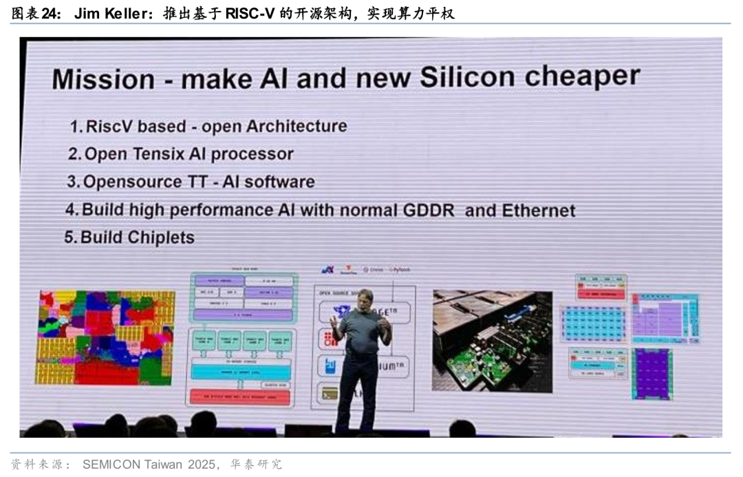半导体知名架构师Jim Keller在CEO论坛上提出了“让AI和新硅芯片更便宜”的愿景。1)Keller表示,基于开源架构的RISC-V CPU采用非HBM存储方案,能够通过Chiplets实现模块化,制造更多、更小、更便宜的芯片,显著降低了AI芯片设计门槛。其“黑洞”芯片采用140个RISC-V处理器阵列的分布式架构,相比传统GPU方案显著降低系统复杂度和运营成本,这种技术民主化路径有望释放更广泛的市场需求并实现规模经济效应。2)该开源模式本质上构建了平台生态,虽然短期收入模式存在不确定性,但长期有望通过降低AI开发门槛和扩大参与者基数实现网络效应。