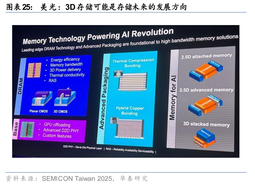 3) 芯片架构正从2.5D向3D堆叠演进,技术路线多元化创造新投资机遇,3D/定制化存储或为追赶者提供弯道超车机会。