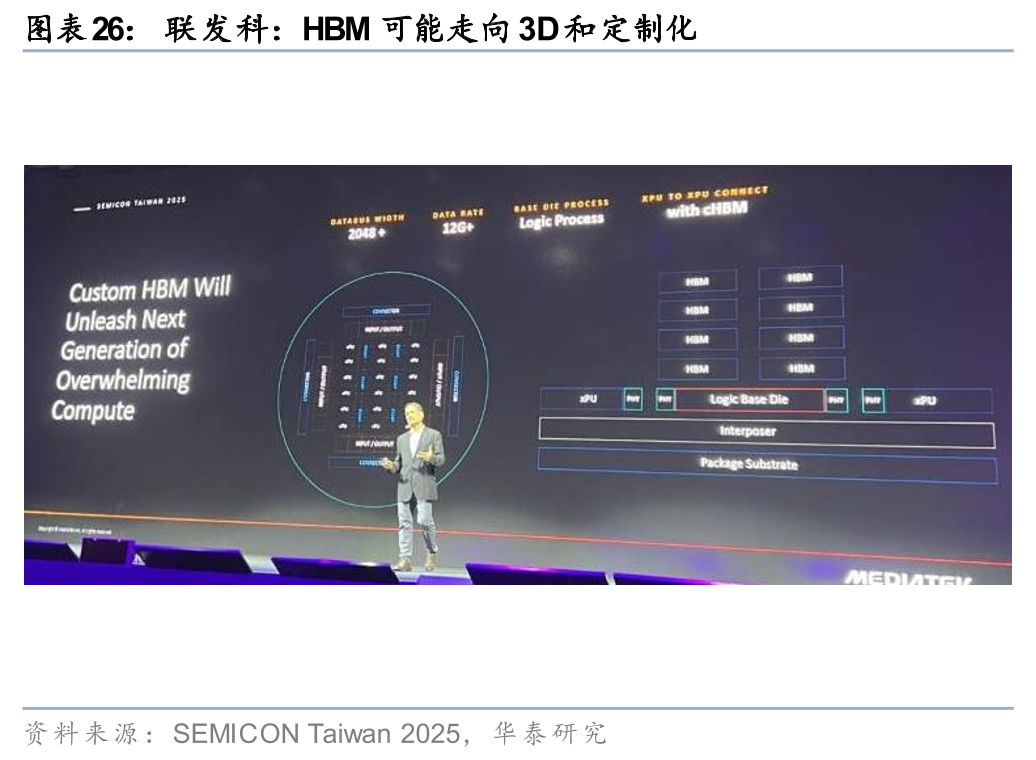 HBM正向3D存储和定制化方向演进,存储与计算的深度耦合成为AI芯片架构创新的核心趋势。存储论坛上,1)美光强调传统DRAM面临的根本挑战是最小特征尺寸已达到5nm,继续按摩尔定律缩放在经济上变得不可行,因此公司正积极开发3D技术,通过硅锗超晶格结构和晶圆键合工艺实现垂直堆叠,以满足AI对HBM日益增长的存储需求。2)联发科则从系统架构角度提出了近存计算的概念,强调随着AI计算从GPU扩展到定制化加速器,存储器必须与计算单元更紧密集成以降低功耗;而定制化HBM将成为满足不同AI工作负载需求的关键。
