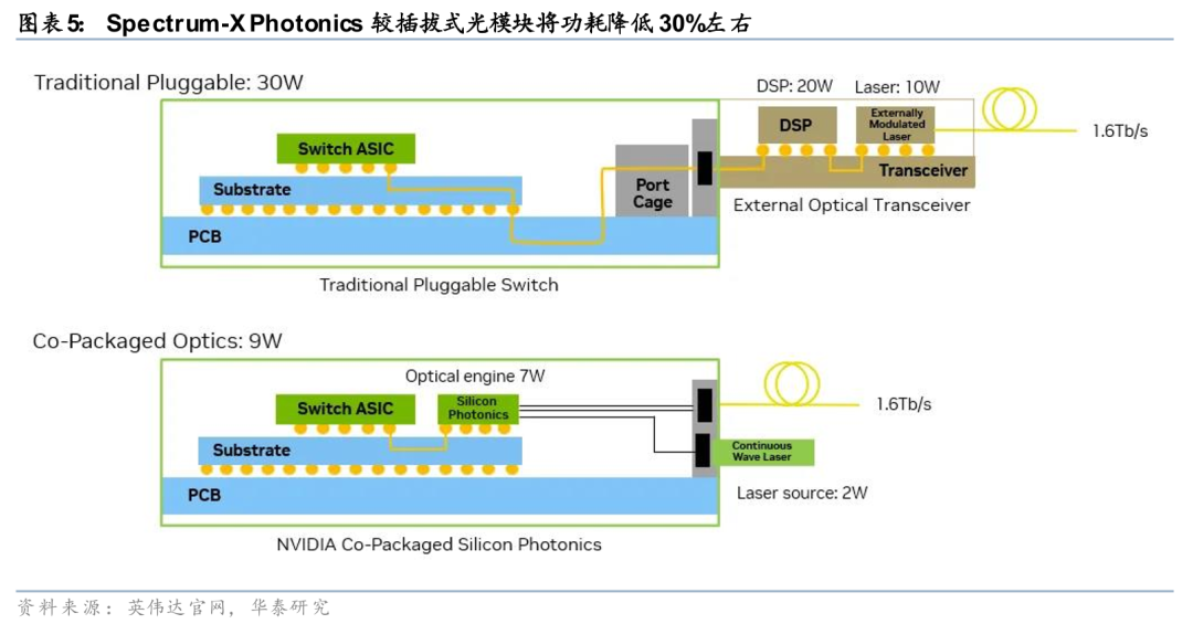 英伟达在展会上表示,CPO是降低网络通信损耗的关键技术。如下图所示,通过节省DSP等器件,CPO和插拔式光模块相比,可以减少30%的能量损耗。