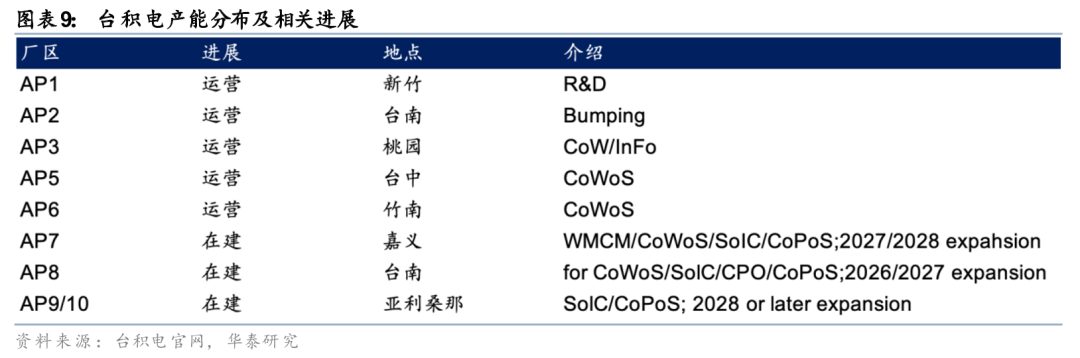产能方面,根据公司官网,其目前已运作的先进封装厂共5座,聚焦CoWoS、SoIC等先进封装业务。此外,AP7/AP8以及亚利桑那的先进封装工厂未来将依次投入生产。公司在展会上表示,当前已将先进封装整合为3DFabric平台,包括TSMC-SoIC、CoWoS和InFO家族,其先进封装平台已经成为AI芯片的主流方案之一。