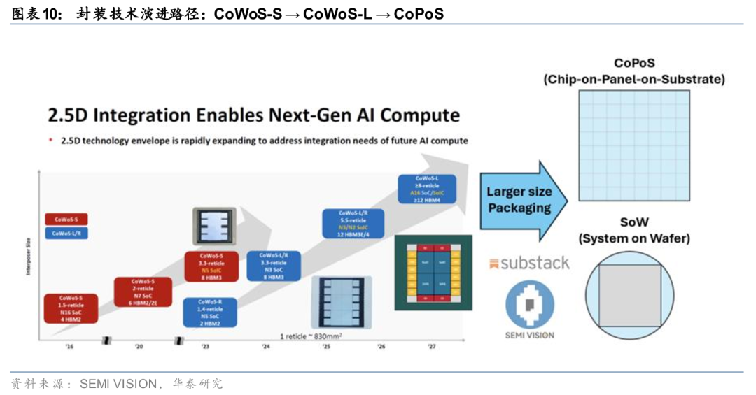 通过这次论坛,我们看到CoPoS作为新兴的2.5D集成封装技术,较之CoWoS能够实现更大尺寸的封装解决方案,有望成为下一代AI计算平台的关键技术路径。根据TECHPOWERUP报道,台积电计划2026年建造一条CoPoS试点生产线;2027年将重点改进工艺、开始商用部署,以便满足合作伙伴的要求;但根据Semi Vision,考虑到大规模量产的工程挑战和良率爬坡过程,CoPoS真正的大规模商业应用可能要延后至2028-2029年。