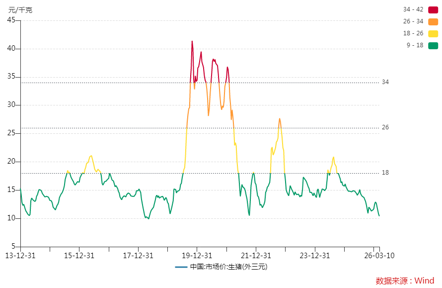 据国家统计局公布的数据,在今年3月上旬这段时间里,国内生猪(外三元)的市场价格是10.4元/公斤。