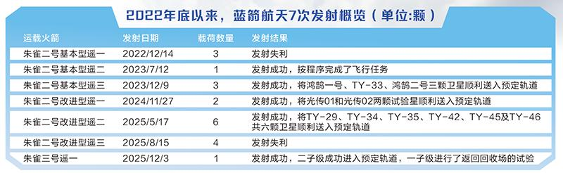 同时,蓝箭航天持续加码火箭发射业务,完成了朱雀二号改进型的研制并执行多次发射任务,并同步推进中大型液氧甲烷可重复使用火箭朱雀三号的研制。2025年12月,蓝箭航天完成朱雀三号遥一运载火箭首次发射,成为中国首枚发射且入轨成功的可重复使用运载火箭。