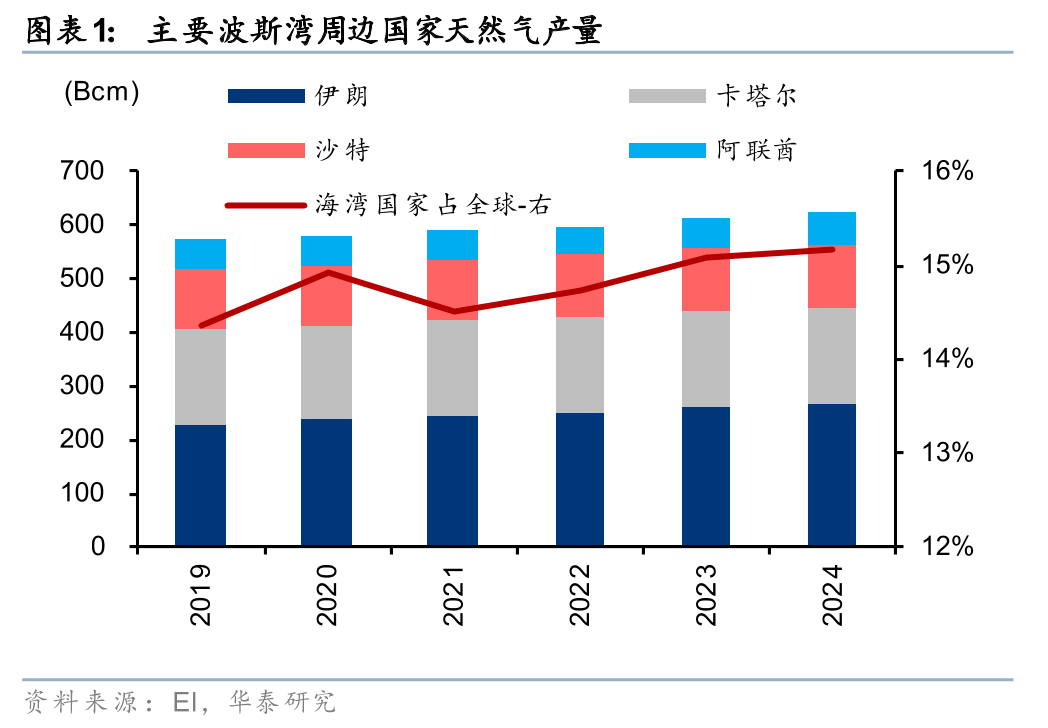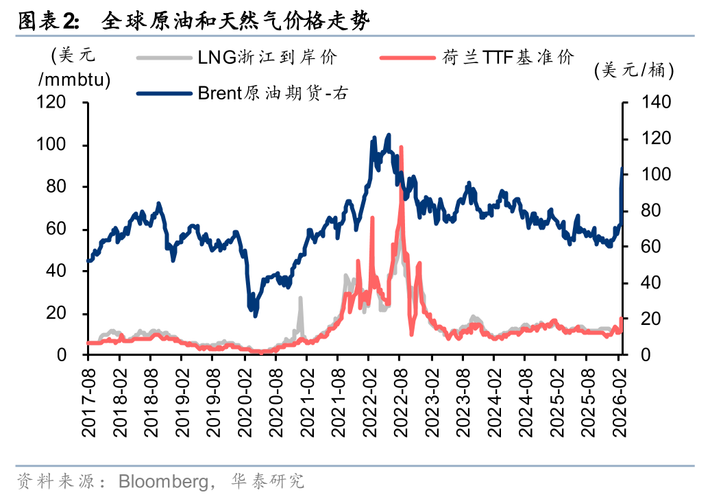 2月底以来美以伊冲突或致全球天然气供应紧张,国际气价已出现显著上涨。据EI统计,24年波斯湾周边天然气产量占全球产量的15%,本轮冲突可能影响的天然气产量达6500亿立方米/年,而24年中东LNG出口量合计1315亿立方米,其中卡塔尔占比81%。本轮冲突导致卡塔尔天然气供应紧张,国际气价已显著上涨,3月13日中国浙江LNG到岸价/荷兰TTF基准价15.88/16.56美元/百万英热,较2月底上涨37%/45%。
