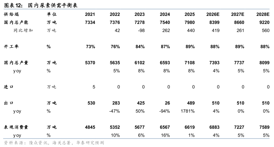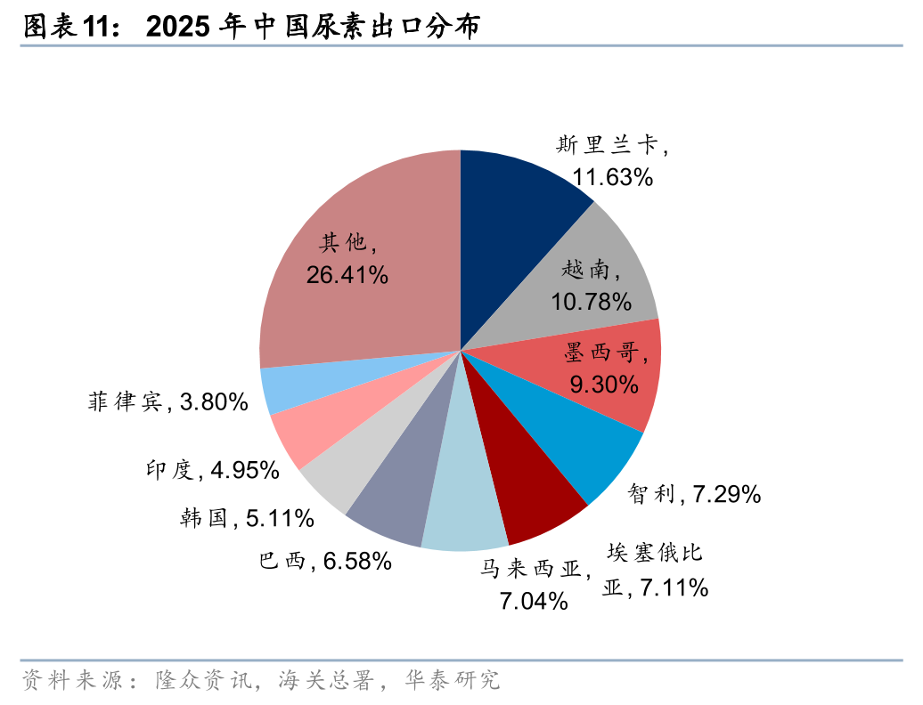由于中国尿素主要通过煤化工生产,国内尿素成本和价格整体稳定。据隆众资讯,截止26年3月18日,国内尿素参考价格1902元/吨,显著低于东南亚CFR价格4900元/吨。3月13日我国尿素开工率94.5%,为春耕保驾护航,我们预计2026年我国尿素产能增长419万吨,在国内需求增加情况下,仍可保持良好供需态势,且存在部分出口能力。伴随中国施肥旺季结束,具备配额的自律企业有望受益于出口盈利。25年我国尿素主要出口地包括斯里兰卡、越南、墨西哥、智利、埃塞俄比亚、马来西亚等国。推荐国内尿素龙头企业。