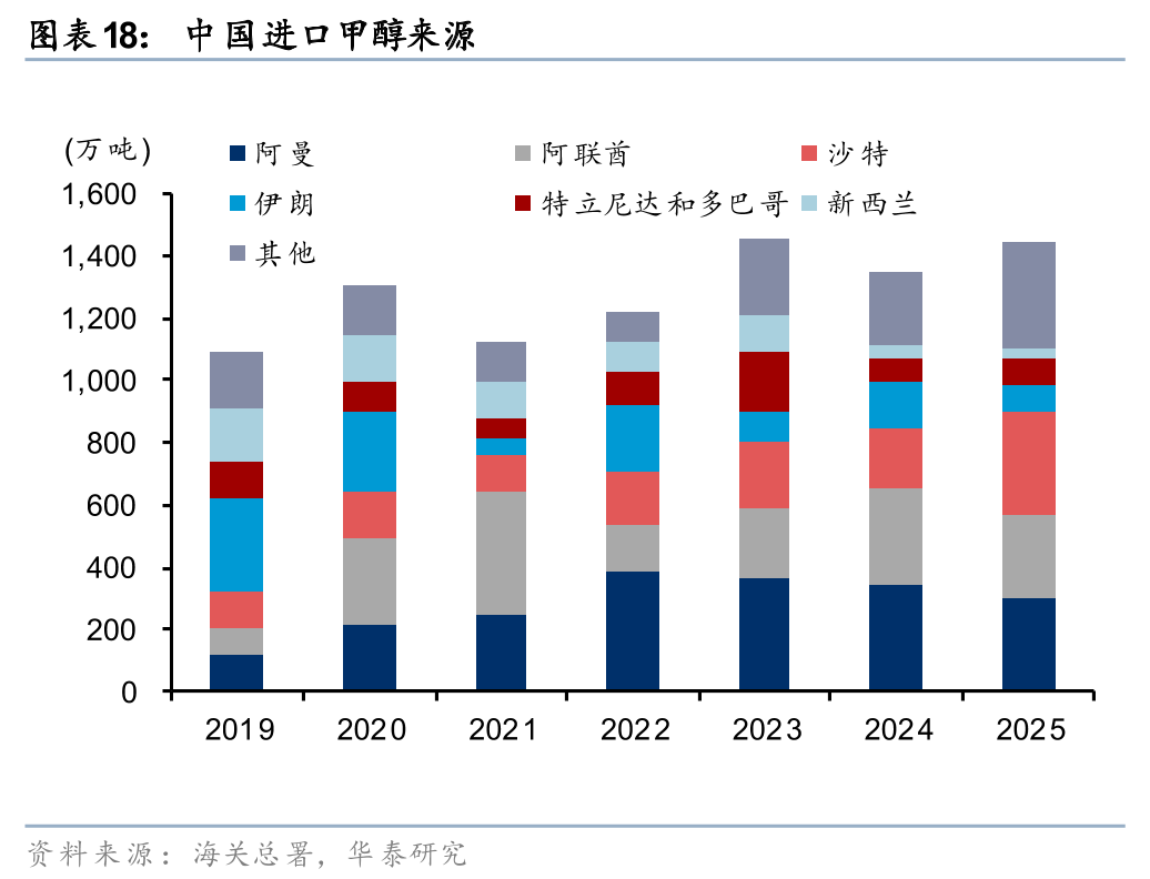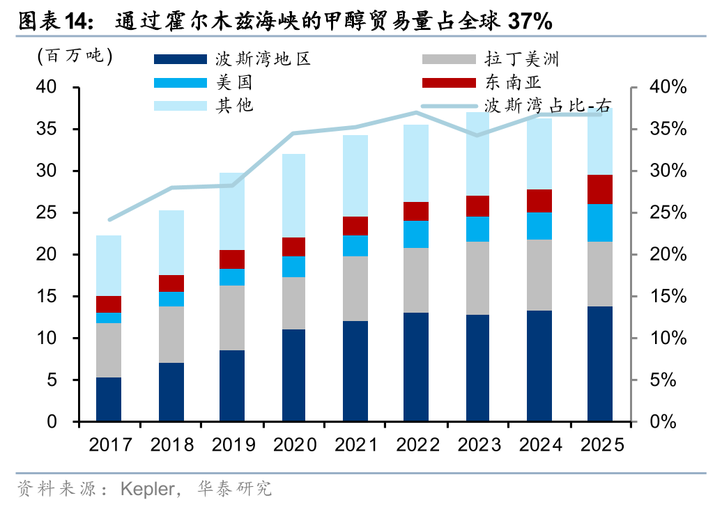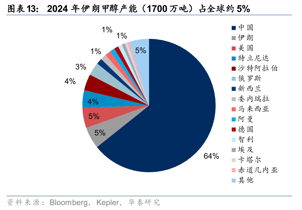 甲醇方面,伊朗是全球第二大生产国、第一大出口国。据Bloomberg和Kepler,2024年伊朗甲醇产能约1700万吨,占全球5%,同时伊朗甲醇的年出口量约450万吨,且根据Kepler统计,25年通过霍尔木兹海峡的甲醇贸易量约3750万吨,占全球37%。本次美以伊冲突以来,伊朗及波斯湾周边甲醇产量下降,以及霍尔木兹海峡通航受阻,或导致包括我国在内的全球甲醇供给缺口。据海关总署,25年中国甲醇进口量约1500万吨,对外依存度13%,其中来自伊朗、沙特等中东国家的进口量占比在70%。