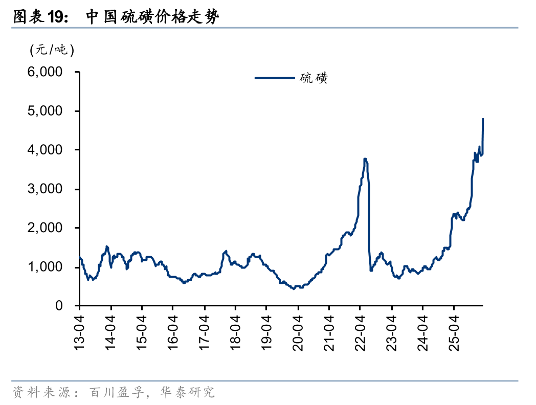 全球硫酸约60%来自硫磺,30%来自金属冶炼副产,10%产自硫铁矿制酸,而原油炼制及天然气加工副产是全球硫磺生产的主要途径。据Kepler,25年经霍尔木兹海峡出口的硫磺占全球近半,叠加原油供给受限导致东亚炼厂负荷存下降预期,且北美页岩油气含硫量偏低,中东硫磺减供后全球供给缺口凸显,我们认为硫磺供需矛盾中期或难以扭转。据S&P Global,全球硫酸约58%用于磷肥,其余包括镍、铜、铀等金属加工,以及钛白粉、尼龙、染料、锂电正极等制造,伴随硫磺供应趋紧以及价格高位,磷石膏制酸、草酸亚铁制磷酸铁、氯化法钛白粉等差异化生产路径的化工项目有望受益。