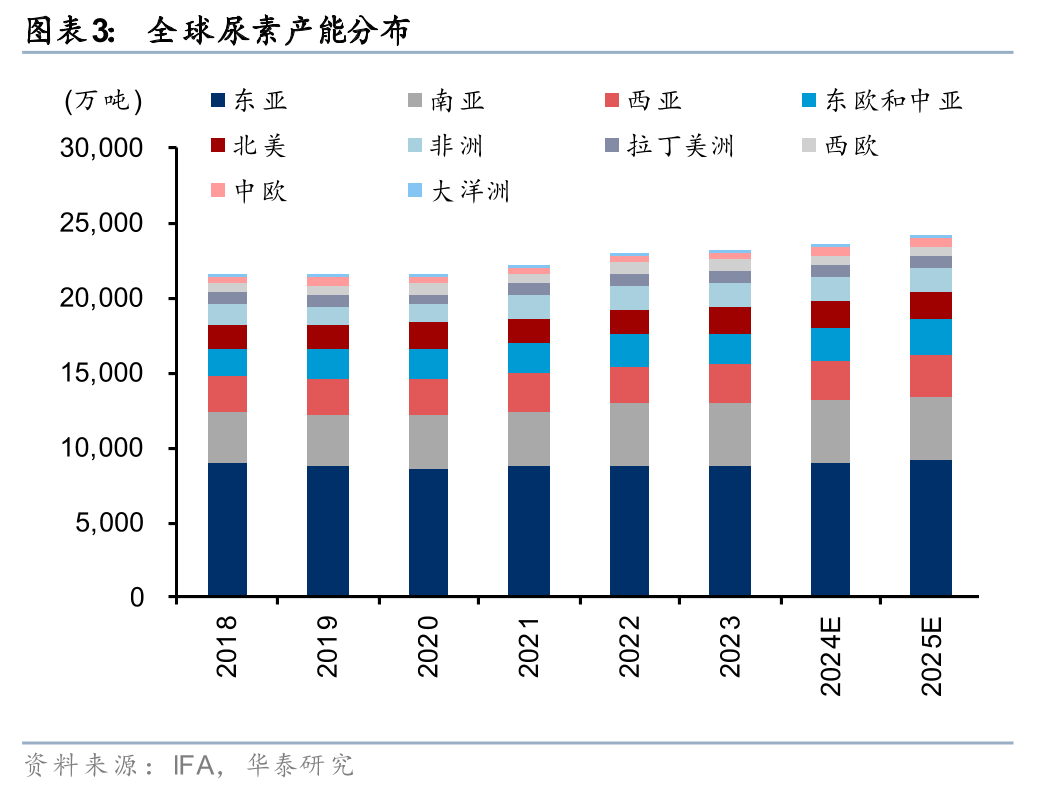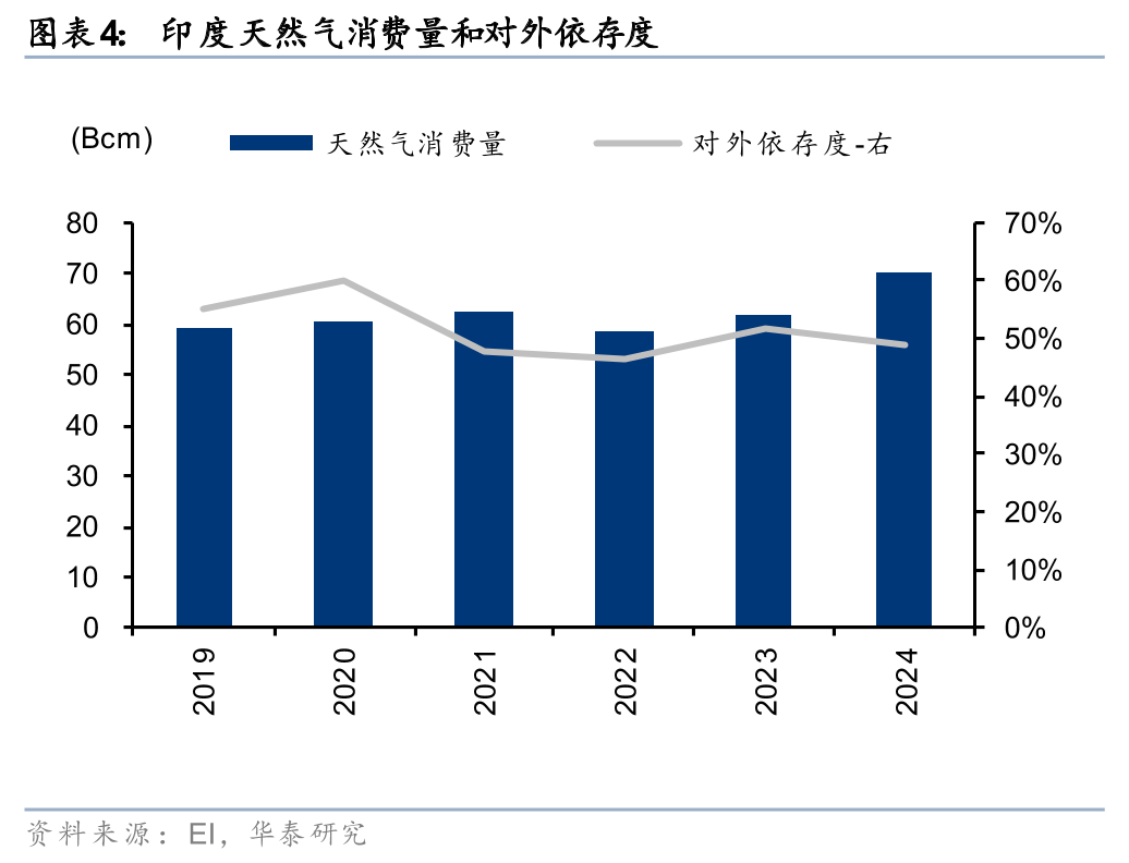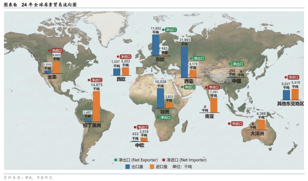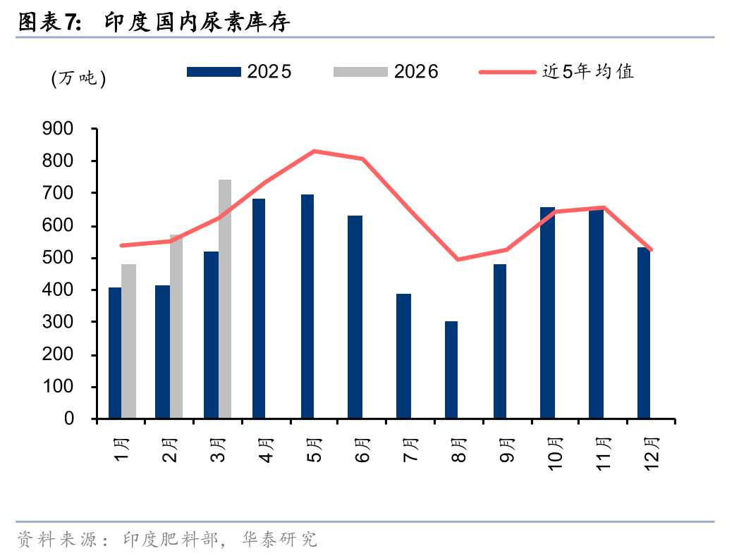 南亚、东南亚等国的国内尿素工厂对天然气原料依赖度较高。据国际肥料协会(IFA)统计,25年全球尿素产能约2.4亿吨,其中天然气制尿素工艺占比约65%,中国产能接近8000万吨,其中煤制工艺占比80%以上。南亚、东南亚国家尿素主要依靠天然气原料,印度24年天然气对外依存度49%,天然气的价格上升及供给缺口导致全球范围气头尿素成本上升,尤其影响南亚、东南亚国家尿素产量。据印度肥料部,25年印度尿素产能约3100万吨,其中煤头尿素产能占比不足5%,而气头尿素占比约80%,剩余产能则依靠石脑油原料。据2024年IFA统计,其他国家中,巴基斯坦、印度尼西亚、马来西亚尿素产能均为气头工艺,越南气头尿素占比约85%,而泰国尿素主要依赖进口。