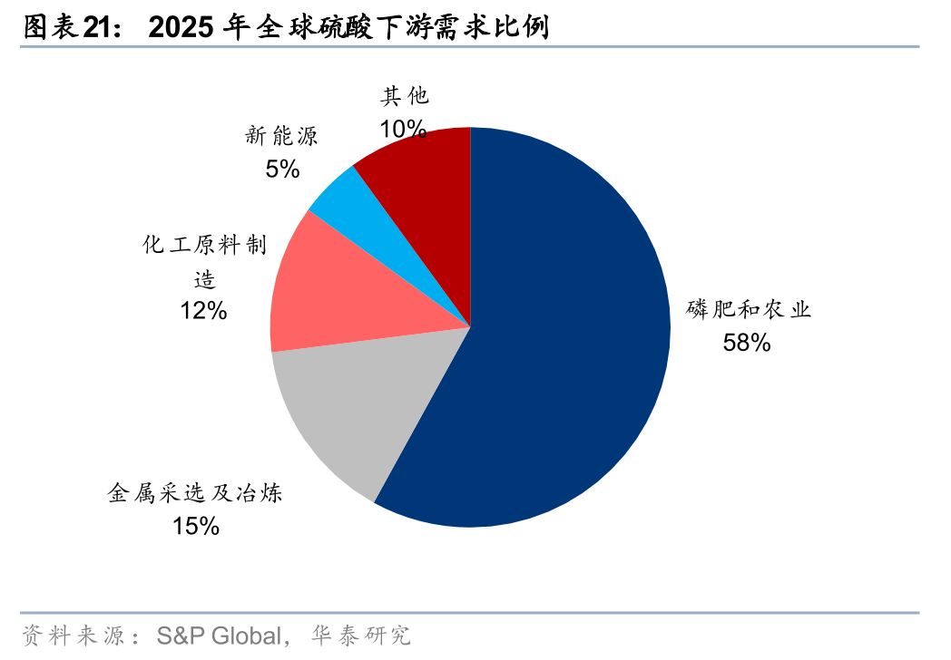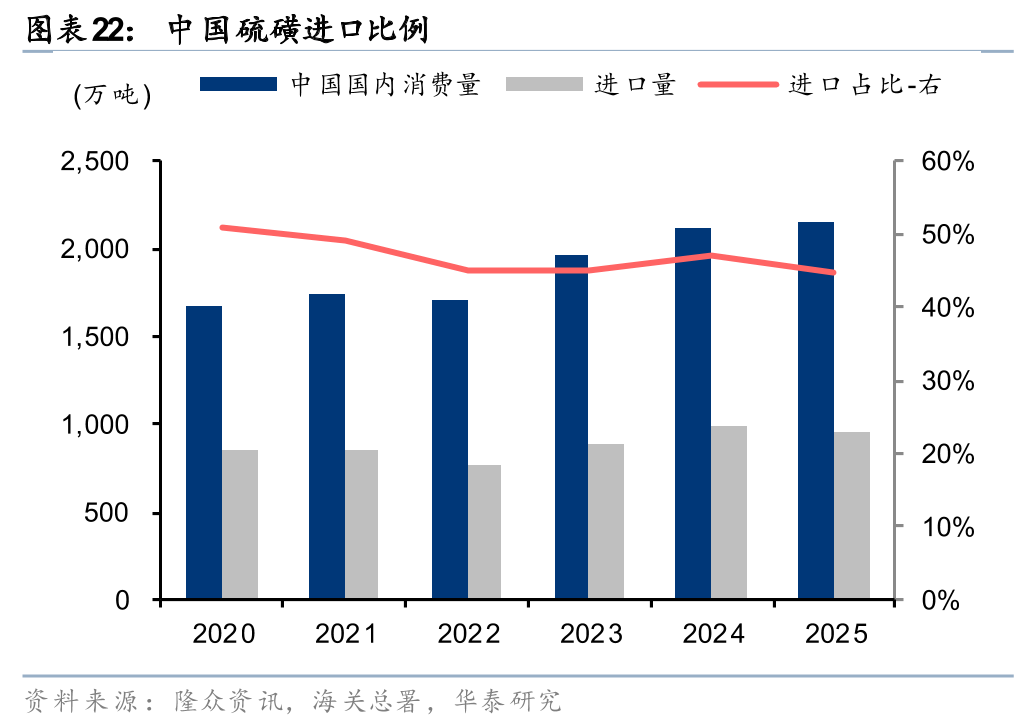 据S&P Global,25年全球58%硫酸应用于下游磷肥及农业,此外还用于镍、铜等有色金属采选冶炼,以及钛白粉、己内酰胺、锂电正极材料等制造。据Bloomberg,中国作为全球最大的硫酸消费国,24年消费量约占全球40%。据隆众资讯,25年中国硫磺制酸在硫酸生产中占比42%,而中国硫磺进口依赖度达45%,硫磺涨价导致国内钛白粉、己内酰胺、磷酸铁等行业成本承压,而采用差异化生产路径的氯化法钛白粉、草酸亚铁法磷酸铁或具备竞争优势。此外,由于中国磷肥产量较大,若硫磺价格持续高位,磷石膏制酸经济性或逐步体现,磷肥企业亦将逐步实现硫酸自给。