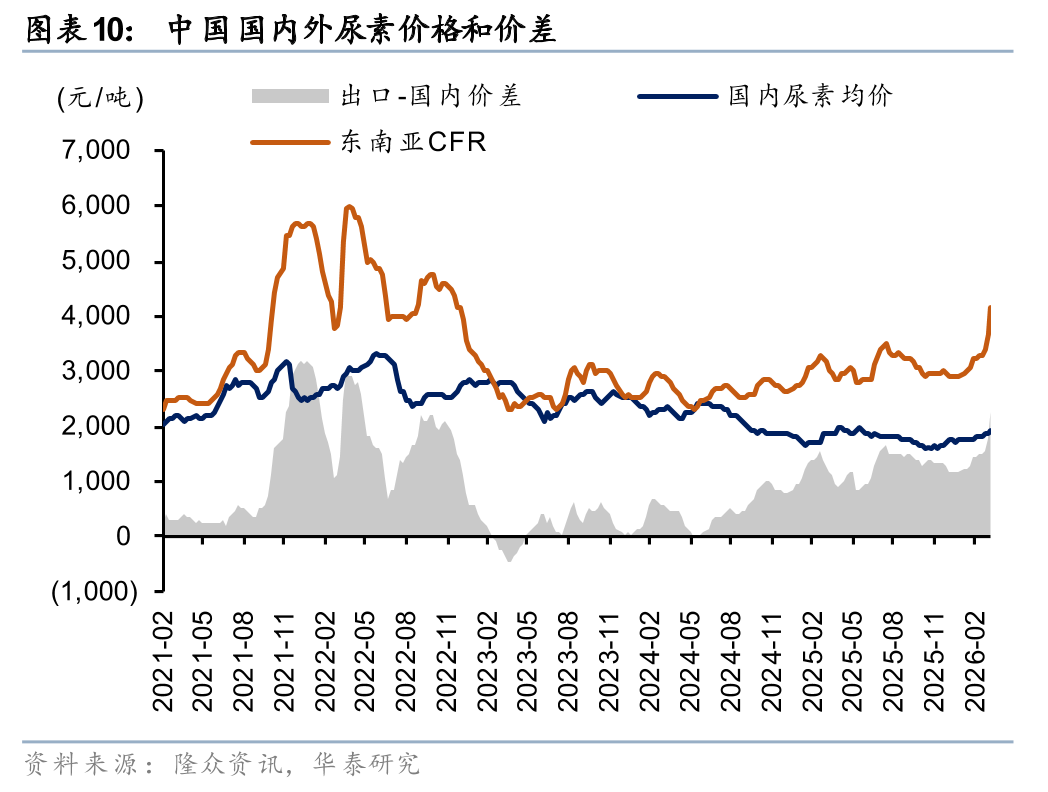 中国方面,伴随26年国内尿素出口法检延续执行,春耕期间化肥供应充足,海外尿素对国内影响或有限,3月18日国内尿素均价1902元/吨,较2月底上涨2%,整体涨幅较小。国内尿素主要采用煤炭原料,25年煤制工艺产能占比80%以上,产能充裕且不依赖进口。美以伊冲突导致全球尿素供应面临冲击背景下,尿素等化肥品种作为粮食安全的基础,战略地位凸显。国内春季用肥结束后,国内生产企业有望迎来尿素出口窗口期,当前国内外尿素价差在2500元/吨以上,推荐国内尿素龙头企业。