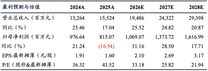 考虑到公司新项目的量产节奏和汽车行业竞争加剧,我们将公司2026-2027年归母净利润的预测下调至10.69亿元、13.74亿元(前值为11.76亿元、14.85亿元),预测2028年归母净利润为16.17亿元,当前市值对应2026-2028年PE分别为33X、26X、22X倍。考虑到公司作为自主内饰件龙头企业,当前正加速全球化发展,并积极布局新兴产业,因此维持“买入”评级。