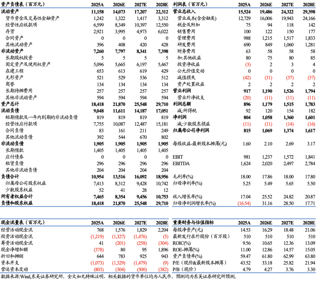 2025年公司毛利率为18.00%,同比-1.64pct。2025Q4单季度公司毛利率为20.12%,同比 2.64pct/环比 4.48pct。期间费用方面,公司2025Q4单季度期间费用率14.00%,同/环比分别 5.80/ 3.23pct;其中,销售/管理/研发/财务费用率分别为0.66%/8.27%/4.55%/0.51%,同比 3.13/ 1.48/ 0.60/ 0.58pct。
