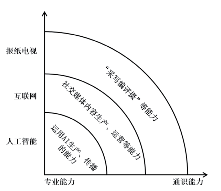 传播学科每一次面对传播技术冲击所作出的人才培养调整,也正是传播学结合新技术重建专业性的过程。在进入大模型驱动下的AI互联网时代,专业要求转为能够运用AI方面,即应用AI进行生产、传播信息的能力,而在大众媒介、PC互联网、移动互联网时代的专业能力培养转化为全民的通识素养。
