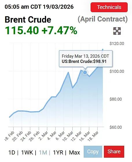 再看WTI美油,从3月11号到3月13号从87美金涨到98.7美金,涨幅13.4%,而3月13号到现在油价涨幅几乎为零。