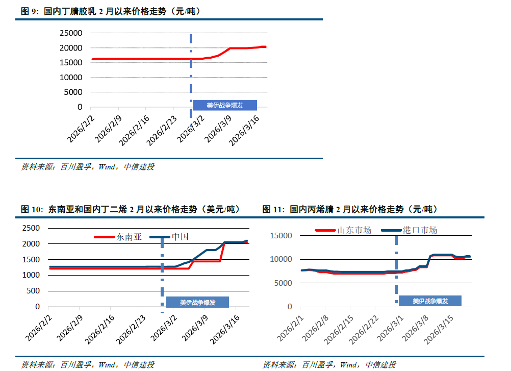 丁腈手套的核心原材料:丁二烯、丙烯腈和丁腈胶乳的价格已经有所上涨。通过跟踪丁腈手套核心原材料的价格波动可以发现,丁腈胶乳、丁二烯、丙烯腈等核心原材料当前价格相比中东地缘冲突爆发前上涨约23%、19%、55%,整体涨幅略低于原油价格涨幅,且涨价时间节点显著滞后于原油价格上涨节点。