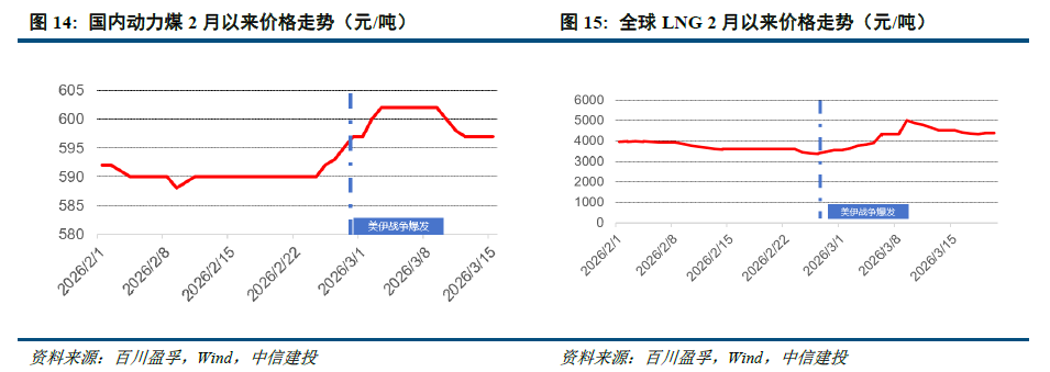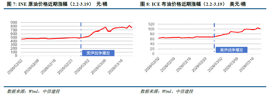 原油价格自中东地缘冲突以来上涨约40%以上。中东地缘冲突自2月28日爆发以来,国际市场原油价格产生较大波动,截至3月19日,INE原油价格较2月27日价格上涨约55% ,ICE布油价格上涨约43% ;受中东局势升级,尤其是国际原油供给大动脉霍尔木兹海峡的通航风险的不确定性,短期原油价格呈现脉冲式上涨后宽幅震荡走势。
