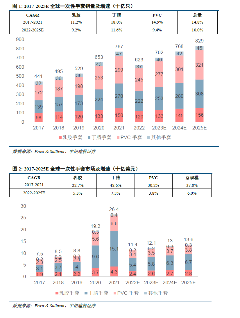 全球一次性手套行业增长稳定,丁腈手套占比持续提升。从销量维度看,2017-2021年全球一次性手套销量由4409亿只增长至7670亿只,年复合增长率(CAGR)达14.8%,其中丁腈手套增速最快(CAGR 18.0%);2020-2021年受全球公共卫生事件的影响,丁腈手套需求大幅增长,2021年销量约为2700亿只。2022年全球公共卫生事件影响逐渐消散,行业采购需求回落。预计2022-2025年丁腈手套份额仍保持提升,由于丁腈手套柔软、贴手并且不含过敏原,生产成本不高,销量维持快速增长,市场占比显著提升。