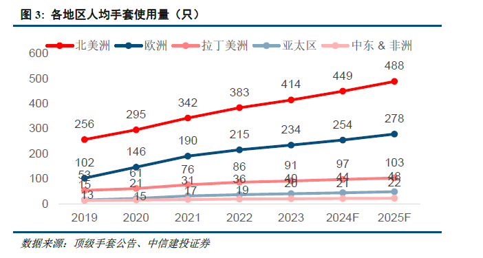 从人均医用手套使用量来看,发达国家远超发展中国家。在与疾病预防及健康防护息息相关的一次性医疗防护手套的应用层面,发展中国家仍然处于使用习惯的培养期。据中红医疗招股书显示,2018年全球一次性医疗防护手套人均使用量达到33只,荷兰、美国等欧美国家更是超过200只,而我国大陆地区人均消费量仅为6只,远低于世界发达国家水平。根据顶级手套披露的数据显示,预计在2025年,北美洲、欧洲、拉丁美洲、亚太区、中东&非洲人均手套使用量分别为488、278、103、48、22只。