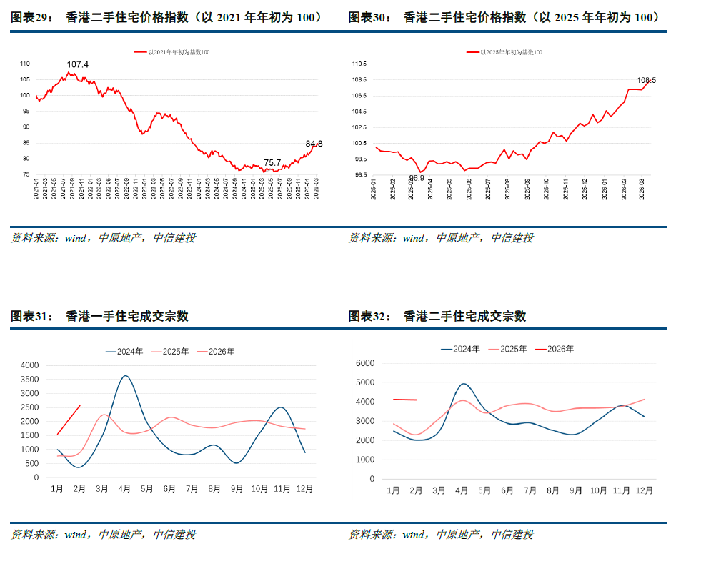 行业观点与投资建议:看好优质商业地产公司、香港开发商、布局核心城市的开发商及二手中介公司。本周中信房地产指数下跌4.10%,沪深300下跌2.19%,板块跑输大盘。本周香港中原城市领先指数环比上升0.5%,较2025年年底上升4.8%,在2月25日香港财政预算案宣布调高1亿元以上住宅物业印花税后,香港楼市表现仍然强劲。据美联物业研究中心综合土地注册处数据,今年首季(截至3月17日)整体住宅注册量已录20,015宗,为近5年首次于第一季突破2万宗,较去年首季的15,906宗按年大幅上涨约25.8%。本周部分房企及物企公告2025年经营业绩,企业表现分化明显,其中绿城服务2025年核心经营利润同比增长24.6%。