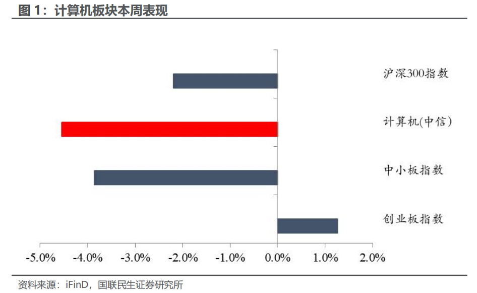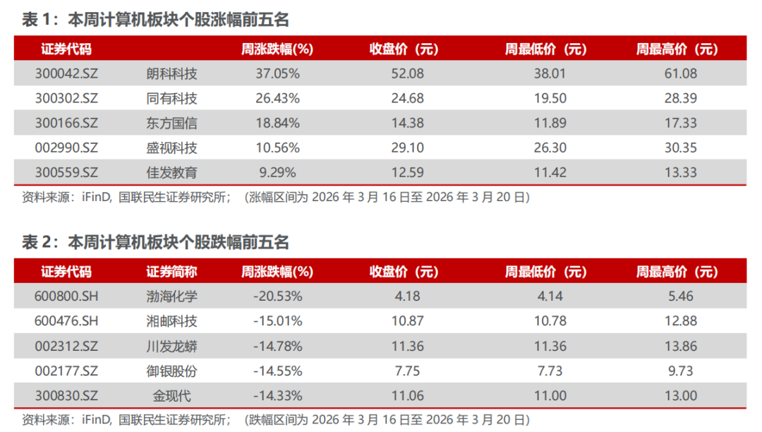 本周(03.16-03.20)沪深300指数下跌2.19%,中小板指数下跌3.86%,创业板指数上涨1.26%,计算机(中信)板块下跌4.54%。板块个股涨幅前五名分别为:朗科科技、同有科技、东方国信、盛世科技、佳发教育;跌幅前五名分别为:渤海化学、湘邮科技、川发龙蟒、御银股份、金现代。
