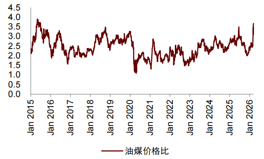 油-煤价差迅速拉大,替代路线企业利润提升。本次美伊冲突对全球原油供应的冲击导致原油和成品油价格大幅上行,以油为主要原材料的化工品价格跟涨。而国内煤价仍处于相对较低的位置,油-煤价差迅速拉大,油煤价格比已提升至2015年以来的99.1%分位,以煤为原材料的替代路线生产企业成本优势扩大。