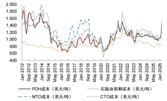 油制烯烃成本抬升,煤制和乙烷制烯烃受中东局势的冲击较小。此次事件冲击沿产业链快速传导,原油、石脑油、LPG等传统烯烃原料同步涨价,叠加航运成本攀升,以石脑油、LPG为核心原料的传统路线成本大幅抬升,利润空间被持续挤压。煤制和乙烷制烯烃路线受中东局势的直接冲击较小,原材料价格暂未出现明显上涨。根据我们测算,若油价上涨10美元/桶,对应烯烃价格完全传导情况下需跟涨507元/吨,80%传导情况下需跟涨406元/吨,具备替代路线产能的公司利润提升。