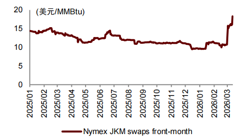 中东局势激化,LNG现货价格已大幅上涨。2026年2月28日,美国与以色列联合发动对伊朗的军事行动,当日晚伊朗伊斯兰革命卫队宣布,禁止任何船只通过霍尔木兹海峡[1];3月2日卡塔尔能源公司发表声明称,由于其位于卡塔尔拉斯拉凡工业城和梅赛义德工业城的运营设施遭到军事袭击,该公司已停止LNG及相关产品的生产[2]。受卡塔尔停产及霍尔木兹海峡(卡塔尔及阿联酋LNG出口均需通过霍尔木兹海峡,据路透社统计,2025年两国合计出口LNG 1167亿方,占全球LNG供应20%)封锁影响,全球LNG现货气价出现大幅上涨,截至3月17日,JKM近月期货价格报18美元/MMBtu,较冲突前涨幅超过70%。