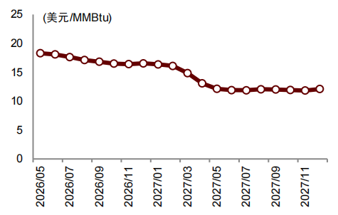 目前的期货曲线隐含市场预期供应影响在一个月左右。根据目前的远期期货曲线,JKM 26年5/6/7/8月合约逐月下行,且远端合约(2027年末)成交价格约12美元/MMBtu,尚未明显走高。我们认为,目前远端合约价格隐含市场预期霍尔木兹海峡的封锁及卡塔尔LNG供应的间断在一个月左右,占全球年度LNG贸易量约1-2%。