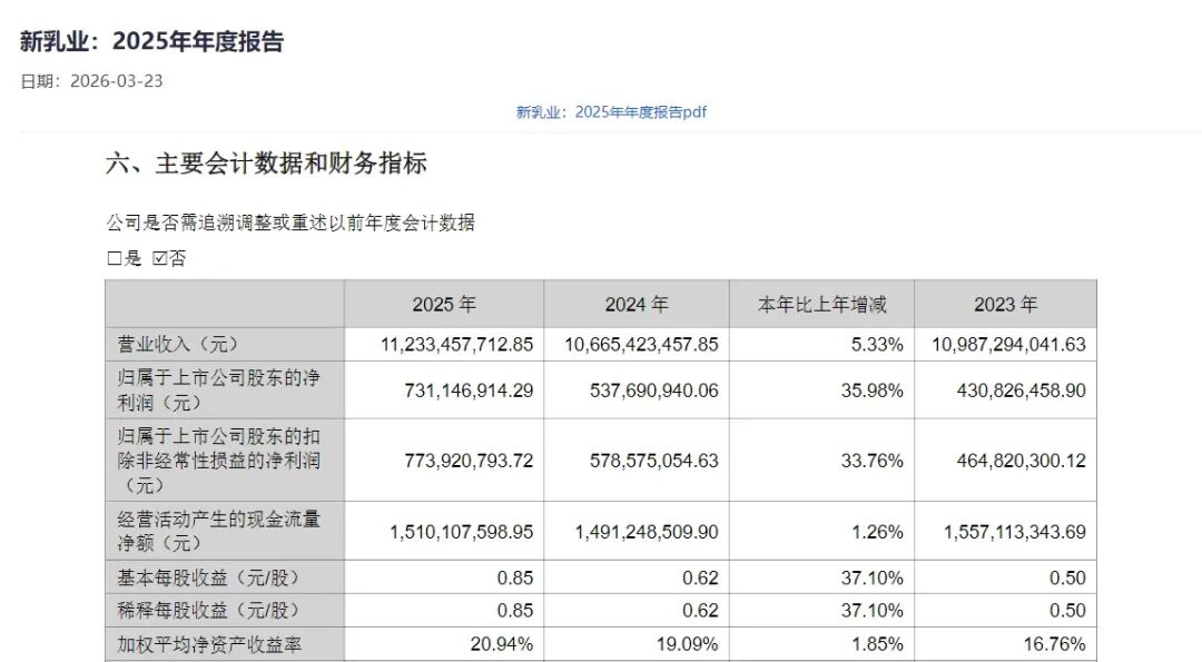 3月22日,新乳业最新发布的2025年年报显示,公司全年实现营业收入112.33亿元,同比增长5.33%;归母净利润7.31亿元,同比增长35.98%;扣非归母净利润7.74亿元,同比增长33.76%。公司2025年度分红预案为对全体股东每10 股派3.80元(含税)。