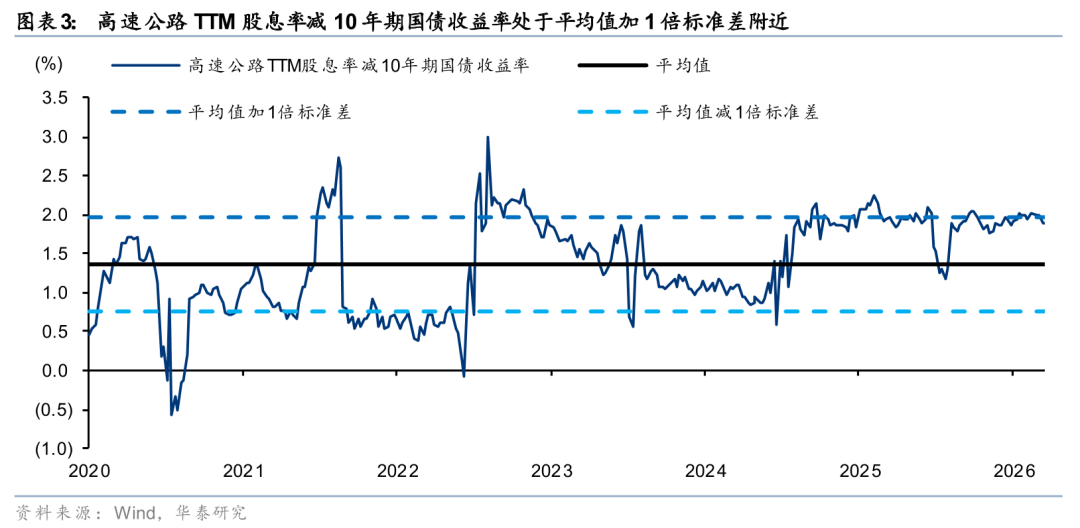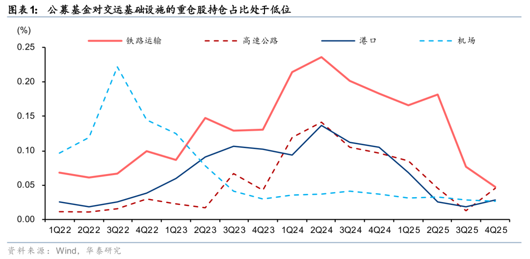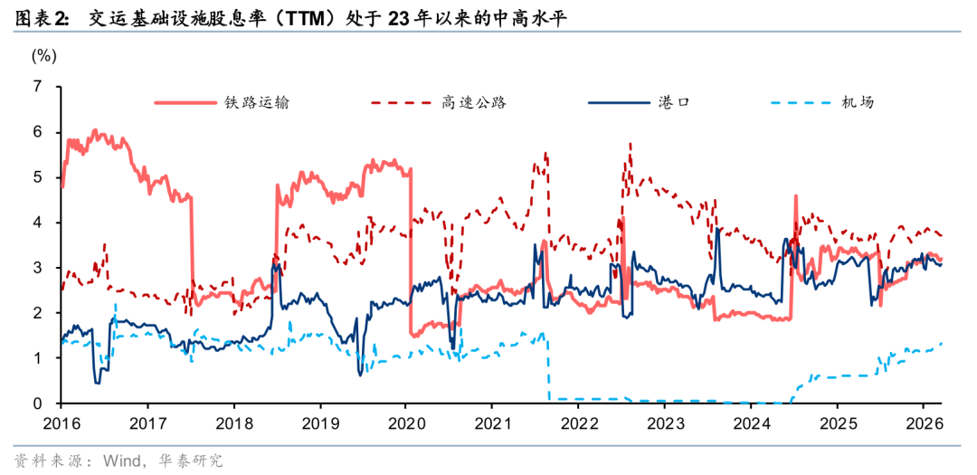 公募对交运基础设施的持仓已降至近三年低位。25年6月以来,受成长风格主导,公募基金持续减持铁路、高速、机场与港口板块,致其显著跑输沪深300指数(分别落后30%、29%、26%、12%)。截至2025年Q4,四板块重仓市值合计仅58亿元,占全部重仓股比例0.147%。其中,铁路、高速、机场、港口持仓比例为24年Q2高点的20%、32%、72%、21%,且已连续两个季度维持低位。当前,铁路、高速、机场、港口TTM股息率分别为3.2%、3.7%、1.3%、3.1%。其中,高速公路股息率较10年期国债收益率高出约190bps,处于历史均值加1倍标准差附近,股息吸引力显著。