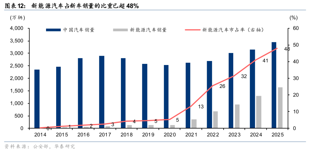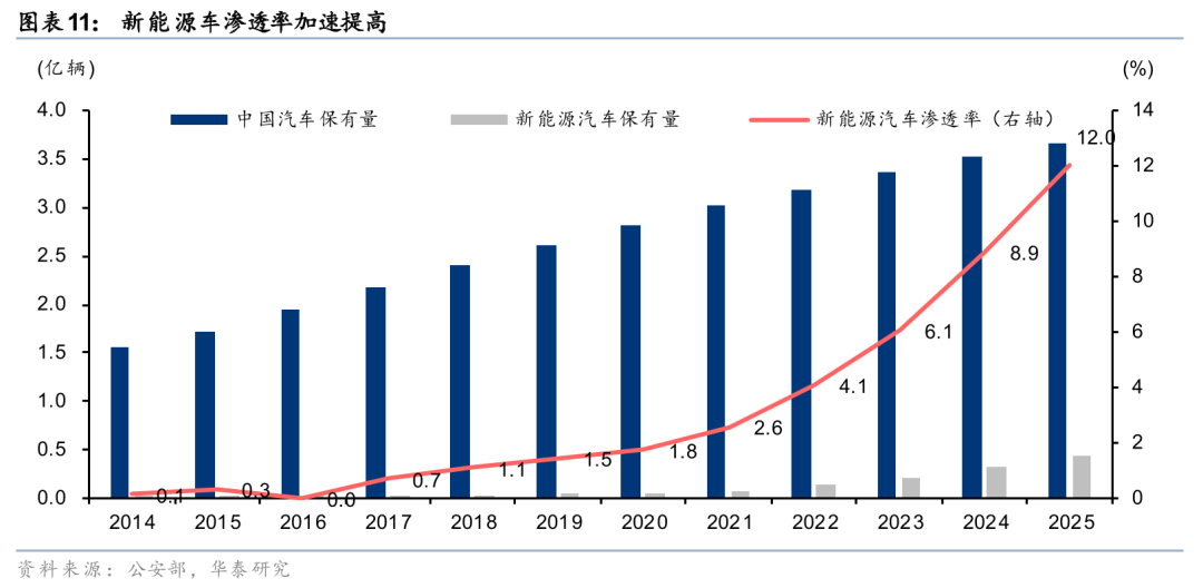2)高油价或催化新能源车加速替代。长期来看,高油价或加快新能源车对燃油车的替代。截至25年底,我国汽车保有量达到3.66亿辆(25年底),其中新能源车占比突破12%,且渗透速度明显加快,25年新车销量中新能源占比已超48%。新能源私家车因充电成本优势和智能化体验,出行频次高于传统燃油车,其渗透率加速提升亦有望促进远期高速公路客车流量增长。