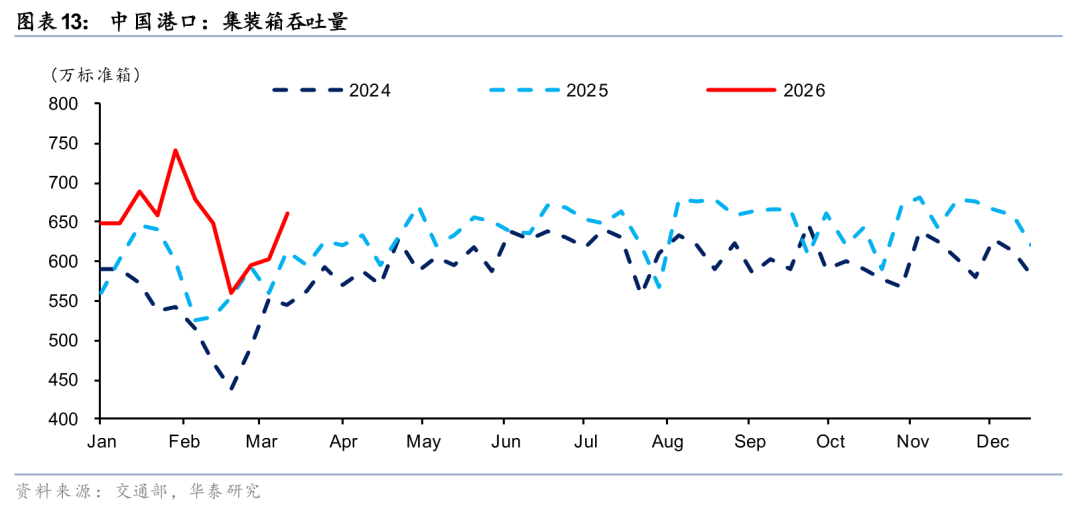 中东局势导致大量商船停摆或改道,港口拥堵、航线重新调配等全球供应链扰动的连锁反应正逐步体现,港口板块呈现“细分分化、结构性机会凸显”的格局:外贸集装箱与散货以及内贸港口,短期货量受春节后复工带动季节性的同环比回升,且散货还叠加内贸需求的补位效应,即便 4–5 月或有货量波动,也是供应链扰动,非需求消失;叠加装卸费、滞期费阶段性上行,核心业务收入与盈利具备较强支撑,防御属性突出。油运码头直接受油品进口量阶段性收缩影响,接卸与中转业务量承压,盈利短期偏弱。成本端,港口以电力、人工为主,燃油敏感度低,整体韧性较强。估值方面,截至3月20日,SW港口板块PE(TTM)为17.5x,股息率为2.6%(TTM)。港口板块整体估值吸引力偏弱,但个股估值偏差较大,可精选个股。
