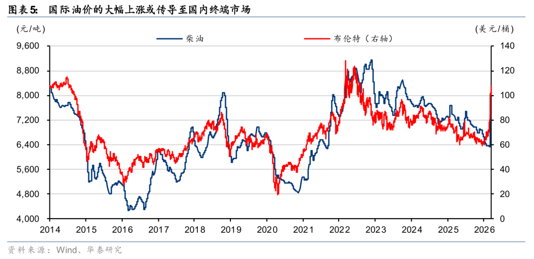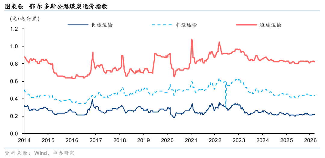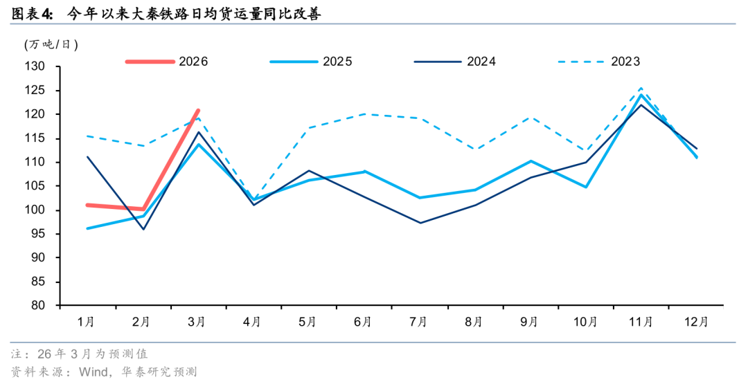 1)西煤东运:进口替代带来增量需求。霍尔木兹局势紧张致海外煤价大幅上行,3月中旬澳洲(5500k)/印尼(3800k)煤炭离岸价格已较年初上涨约26/29%。进口煤已显著高于内贸长协煤价格,或抑制进口需求,供需缺口由国内产能填补,利好“西煤东运”铁路。3月1-18日,环渤海港口铁路煤炭调入量同比 7%;其中大秦线日均运量约121万吨(同比 8%),尤其是3月中旬逼近125万吨满载水平。重载铁路多为电气化线路,运营成本受油价冲击小。3月上半月鄂尔多斯煤炭公路运价在长、中、短途场景同比上涨4.2%、3.6%、2.1%,凸显铁路成本优势。若海外能源紧张延续到6月,叠加夏季用电高峰,大秦铁路有望实现量价齐升。国际能源紧缺利好国内煤化工,间接提振液体化学品铁路特种集装箱运输需求。