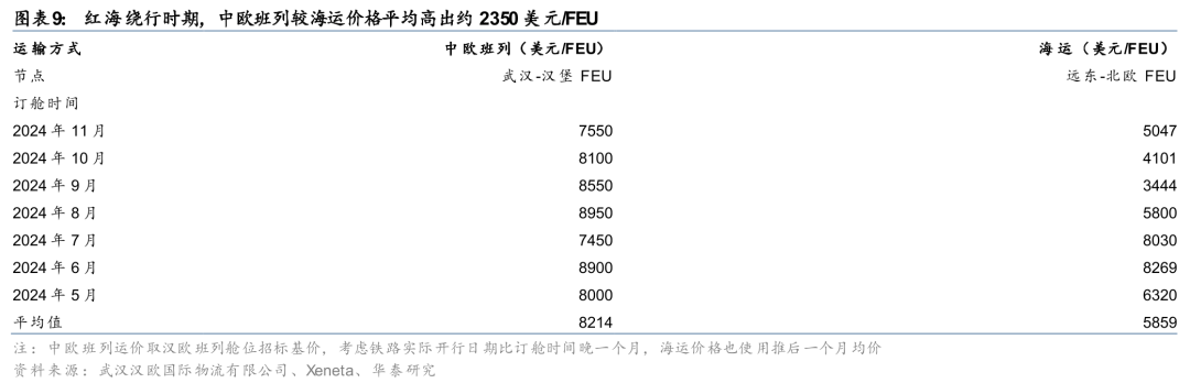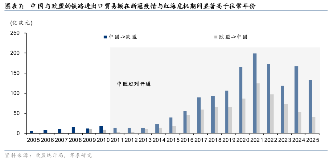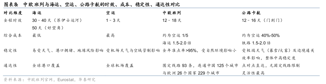 3)国际物流:中欧班列受益海运溢出。美以伊冲突升级致苏伊士运河再度停摆,绕行好望角使运输时间与不确定性上升。对高附加值、中等批量、时效敏感型货物(如机电、汽车、跨境电商等),中欧班列的吸引力大幅提升。中欧班列运输时间仅12–18天,较海运(苏伊士运河30-40天、好望角约50天)节省超50%;铁路费用约为空运的1/5、海运的1.5-2.0倍。