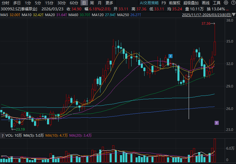 二级市场上,今年以来,泰福泵业股价迎来上涨,截至3月23日,股价报收34.9元/股,累计涨幅约30%,最新总市值33.3亿元。