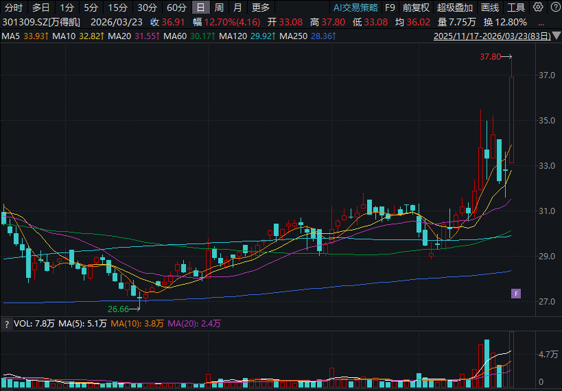 3月23日万得凯股价高开高走,日内上涨12.7%,收于36.91元/股,盘中股价创历史新高。
