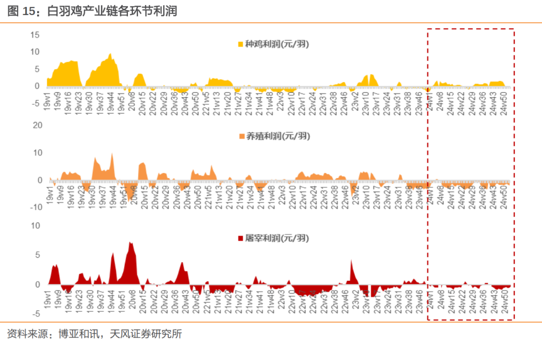 产业链利润分布不均衡,养殖端、屠宰端承压明显。受前期海外引种收缩、前期行业换羽等影响,鸡苗供给边际下滑;而2024上半年屠宰端产能仍有小幅增加,推动2024下半年的鸡苗价格景气上行,而肉毛鸡出栏价格则维持相对低位。受此影响,2024年白羽鸡产业链利润亦主要集中在上游种禽端,养殖端、屠宰端整体处于亏损状态。我们认为,养殖端承压亏损,叠加鸡苗成本边际上行,或抑制尾部企业补栏意愿。