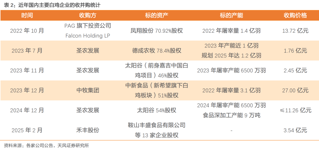 行业洗牌加速,开启头部整合。近3年白羽鸡产业收并购动作频发,2022年Falcon Holding LP投资收购凤翔股份,2023年圣农发展先后收购德成农牧、太阳谷(嘉吉中国的白鸡业务),中牧集团亦收购新希望旗下的白鸡板块。2024年12月,圣农发展公告拟继续收购太阳谷54%股权,持股比例将由46%增至100%。行业或已迎来头部整合加速阶段。