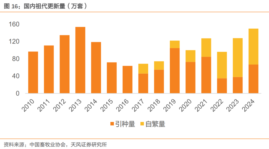 24年祖代表观更新总量较大,其中海外引种收缩已2 年。根据畜牧业协会,2024年国内祖代更新总量150万套,同比 17.3%,处于近年相对高位;其中,进口67万套、占比45%,自繁83万套、占比55%。细分品种结构看,