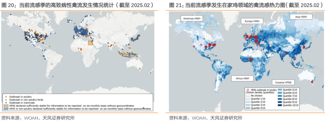 高致病性禽流感传播蔓延,后续引种不确定性犹存。3月17日,联合国粮农组织FAO发出警示,全球高致病性禽流感H5N1的传播已达“前所未有”规模,并导致数亿只禽类死亡。根据世界动物卫生组织,24/25流感季前5个月,全球累计报告家禽领域发生高致病性禽流感949起,已超23/24流感季全年数量;其中,美国、欧盟地区尤为严重,25年2月分别新发H5N1禽流感54起、49起,香港已于3月宣布暂停从波兰、英国部分地区的禽类产品进口,后续引种存仍在较大不确定性。