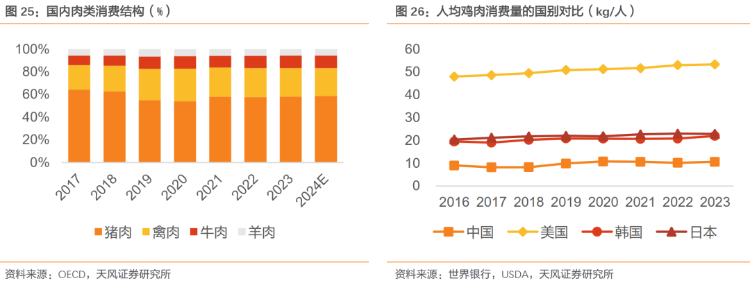 禽肉是国内第二大消费肉类,近年来鸡肉需求中枢抬升。OECD数据显示,2023年国内禽肉消费量占比25.1%,仅次于猪肉,较2017年提升3.4 pct;其中,禽肉供给约有60%来自白羽肉鸡。特别在上一轮“非瘟”驱动下,白鸡对猪肉的消费替代明显,“非瘟”后虽有回补,但饮食习惯培育和消费渠道已成,2019年后禽肉人均消费已上行并保持在10kg/人以上;而对标美国、韩国、日本,国内人均鸡肉消费尚有提升空间。我们认为,随着外卖餐饮、运动健身等对鸡肉的高蛋白需求增加,国内白鸡消费需求中枢有望进一步抬升。