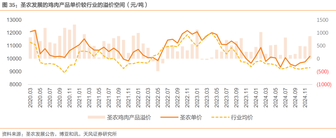 公司拥有优质客户资源,产品对比行业溢价明显。公司拥有国际知名客户资源,是2008年北京奥运会、2010年上海世博会、广州亚运会、2011年深圳大运会、2015年福州青运会、杭州G20会议、2017年厦门金砖会议的鸡肉原料供应商,于2021年与宜家打造全球首例“better chicken”,落地宜家全国34家门店。相较于行业鸡肉均价,公司鸡肉产品溢价基本保持在500元/吨左右;最新2024年12月数据看,公司鸡肉产品的平均售价领先于行业突破10000元/吨,环比涨幅4.5%(对比12月行业均价环比涨幅0.4%),较行业溢价近900元/吨。我们认为,海外引种持续受限,叠加促消费政策提振,预计后续鸡肉价格有望景气上行;公司凭借优质的渠道、客户资源,产品溢价明显,有望显著受益。