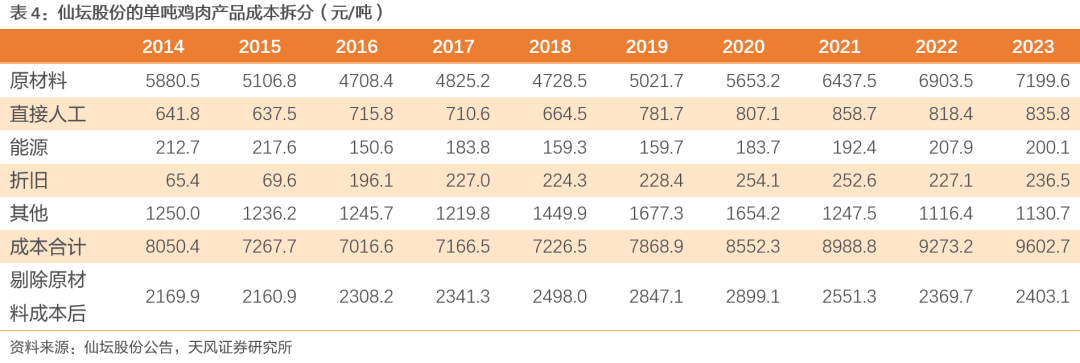 纵向比较看,公司造肉成本呈下降趋势,2013-2023年单吨鸡肉成本由10556元/吨逐步降至8058元/吨,累计降幅23.7%,其中2020-2022年成本上行主要系受大宗原材料涨价影响;剔除原材料影响后的单吨成本下降趋势更为明显,2013-2023年累计降幅26.3%,侧面反映订单一体化、仓储物流优化等管理效率精进。