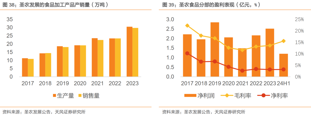 公司自2017年收购并表圣农食品以来,食品加工业务持续增长,2017-2023年销量由10.9万吨增至29.8万吨,CAGR 18.3%;收入由21.7亿元增至63.9亿元,CAGR 19.8%,收入占比亦由21.3%提升至34.6%;2024H1食品加工收入31.0亿元,收入占比35.1%。