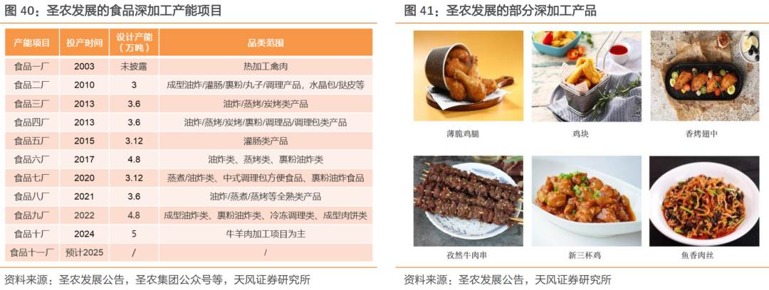 扩产有序推进,护航大食品战略。截至24H1,公司已建及在建食品深加工产能合计超50万吨,位列全国第一;生产线覆盖覆盖中式调理包、冷冻调理线、油炸、蒸煮、碳烤、烟熏、灌肠等工艺,自动化和柔性设计可及时满足客户的临时需求。2024年,圣农食品十厂正式投产,配备10条生产线,拥有食品深加工年产能约6万吨,覆盖油炸、蒸煮、蒸烤等工艺,主要用于牛肉加工,产品供应国内外主流餐饮品牌。此外,圣农食品十一厂有望在2025年投产,推动规划总产能储备增至60万吨;我们认为,随着熟食产能有序落地,公司在提高产能的同时亦丰富了产品品类,为“大食品战略”奠定供应基础。